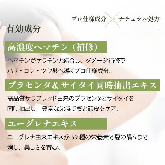 サロン帰りのような髪のためのプロ仕様の「徹底補修成分」。髪の毛の主成分であるケラチンと結合するヘマチンの特性を、ヘアケアに応用。ヘマチンが空洞化したダメージヘアを補修することで、ハリ・コシ・ツヤ髪へ導きます。